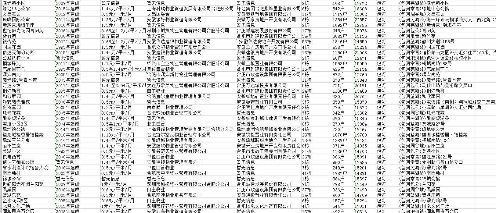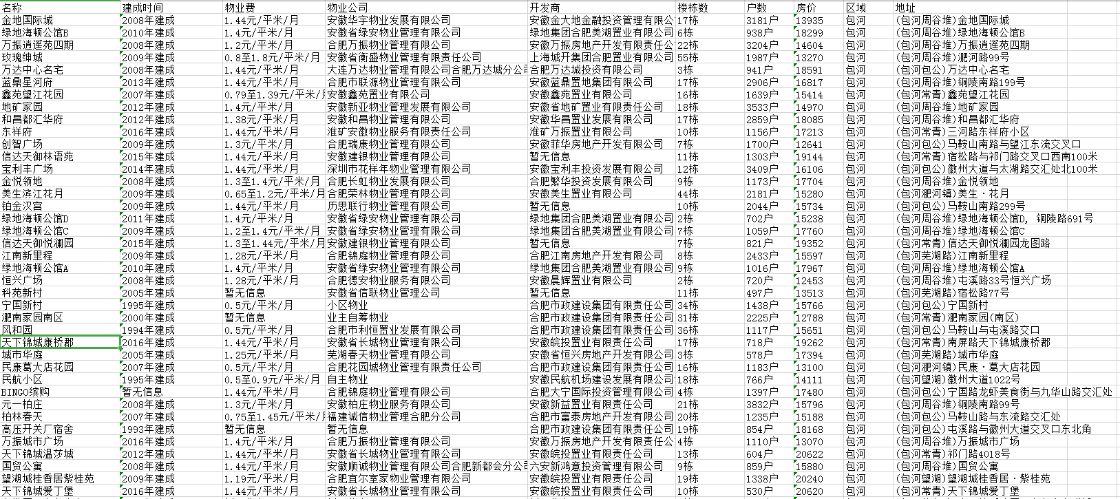 今天小采給大家?guī)淼臄?shù)據(jù)福利就是合肥地區(qū)內(nèi)3300的小區(qū)的數(shù)據(jù)信息,包含有小區(qū)的名稱、建成時間,小區(qū)物業(yè)費(fèi)收費(fèi)標(biāo)準(zhǔn)、所屬的物業(yè)公司及開發(fā)商、小區(qū)的棟數(shù)、戶數(shù)、地理位置和當(dāng)下的房價。